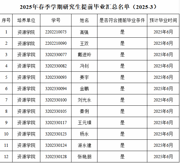 根据学校的相关通知要求,经研究生个人申请,学院初审,beat365中文官方网站2023级硕士研究生(不含硕博连读、提前攻博研究生)、2022级博士研究生(不含直博生)、2020级直博生申请提前毕业名单如下,如有异议,请公示期内书面反馈意见至研究生科(联系人:周老师,办公室:主楼336,电话:67883627),公示期即日起至2025年3月2日。