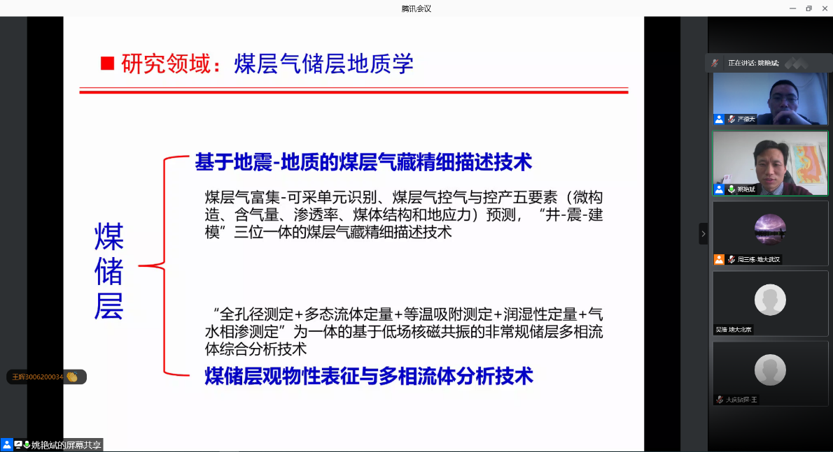 2020年12月15日,应学院严德天教授和周三栋教授邀请,beat365中文官方网站(北京)姚艳斌教授同师生线上交流并作题为“煤储层物性与流体特征分析新技术:核磁共振”的学术报告。