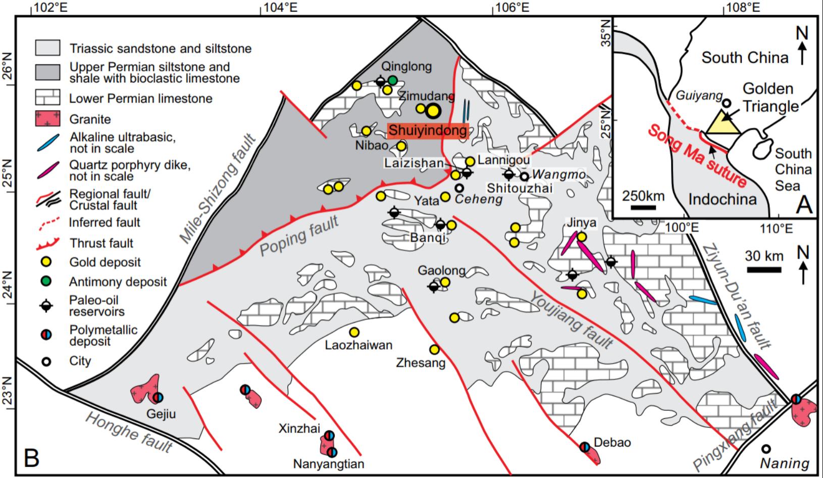 我国西南右江盆地中发育了大量赋存于沉积岩中的金矿床(图1),其矿化地质特征与卡林型金矿床具有诸多相似之处,被认为是目前除了美国内华达地区以外世界上最大的卡林型金矿矿集区。近期,beat365中文官方网站(武汉)李建威教授团队的靳晓野助理研究员利用稀有气体同位素和LA-(MC)-ICP-MS方解石U-Pb测年法分别对该地区的典型金矿床开展了矿床地球化学示踪和成矿年代学研究,旨在为区域及其他地区卡林型金矿床的矿床成因研究提供新的思路或借鉴。