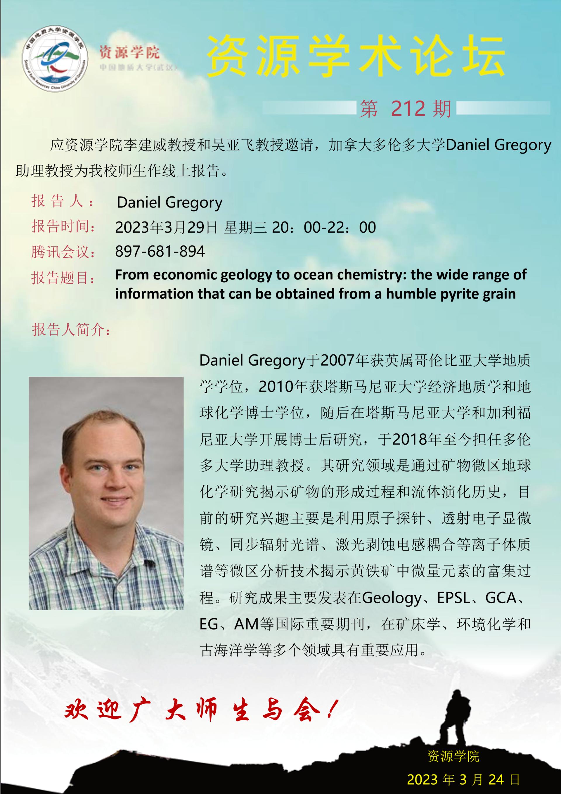 【3月29日】第212期资源学术论坛:Daniel Gregory学术报告