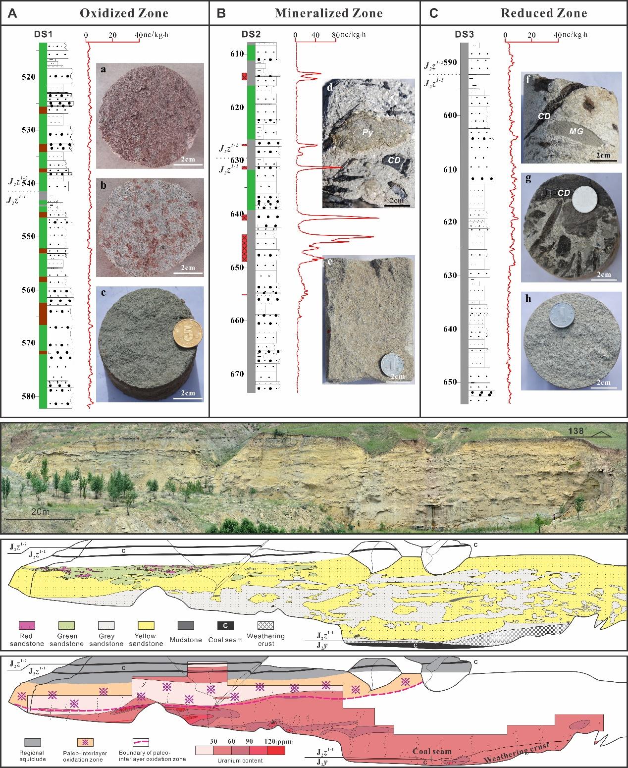 beat365中文官方网站(武汉)beat365中文官方网站焦养泉教授团队的博士后乐亮(合作导师:赵军红教授)选取我国北方最重要的产铀盆地之一——鄂尔多斯盆地的东胜铀矿田为研究对象,该矿田铀储层经历了复杂的流体事件,包括(1)层间氧化作用;(2)烃类流体二次还原作用;和(3)地表氧化作用。在细致的野外露头剖面写实与钻孔岩心编录基础上,结合环境敏感参数与微量U-Th测试,笔者重点对铀储层中不同岩石地球化学类型砂岩开展了微区矿物学与同位素地球化学分析,对氧化-还原微环境的变化和成矿过程进行了深入探讨,取得了如下主要认识: