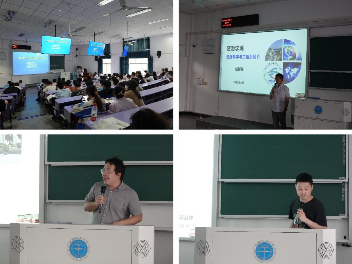 第二阶段开展了“资源科学与工程系师生面对面交流会”,旨在帮助大一学生选择合适的本科生导师,为大三学生提供选择读研和深造团队的建议,活动由刘文浩副主任主持。会上,赵新福主任首先介绍了资源系的概况,强调了资源系在科学研究和行业发展中的地位和优势,希望大一同学坚定专业学习的信心、大三同学积极选择适合的团队进行读研和深造。随后青年人才姚桌森老师分享了自己在地质领域学习和研究的乐趣,启发式的介绍自己选择专业和导师团队的心得,鼓励学生在面对选择时要忠于自己的兴趣和激情。苏治坤老师以“取经之路,就在脚下”为题,讲述了土生土长地大人从学生到教师的成长过程,强调平台、导师、个人学习和实践对于成才的重要性。赵新福、付乐兵、刘泽瑞、阮班晓、刘文浩、皮道会、陈鑫等老师分别介绍了自己所在研究团队和领域,分享了个人的学术和职业经历,鼓励学生们根据兴趣和职业目标做出明智的选择。