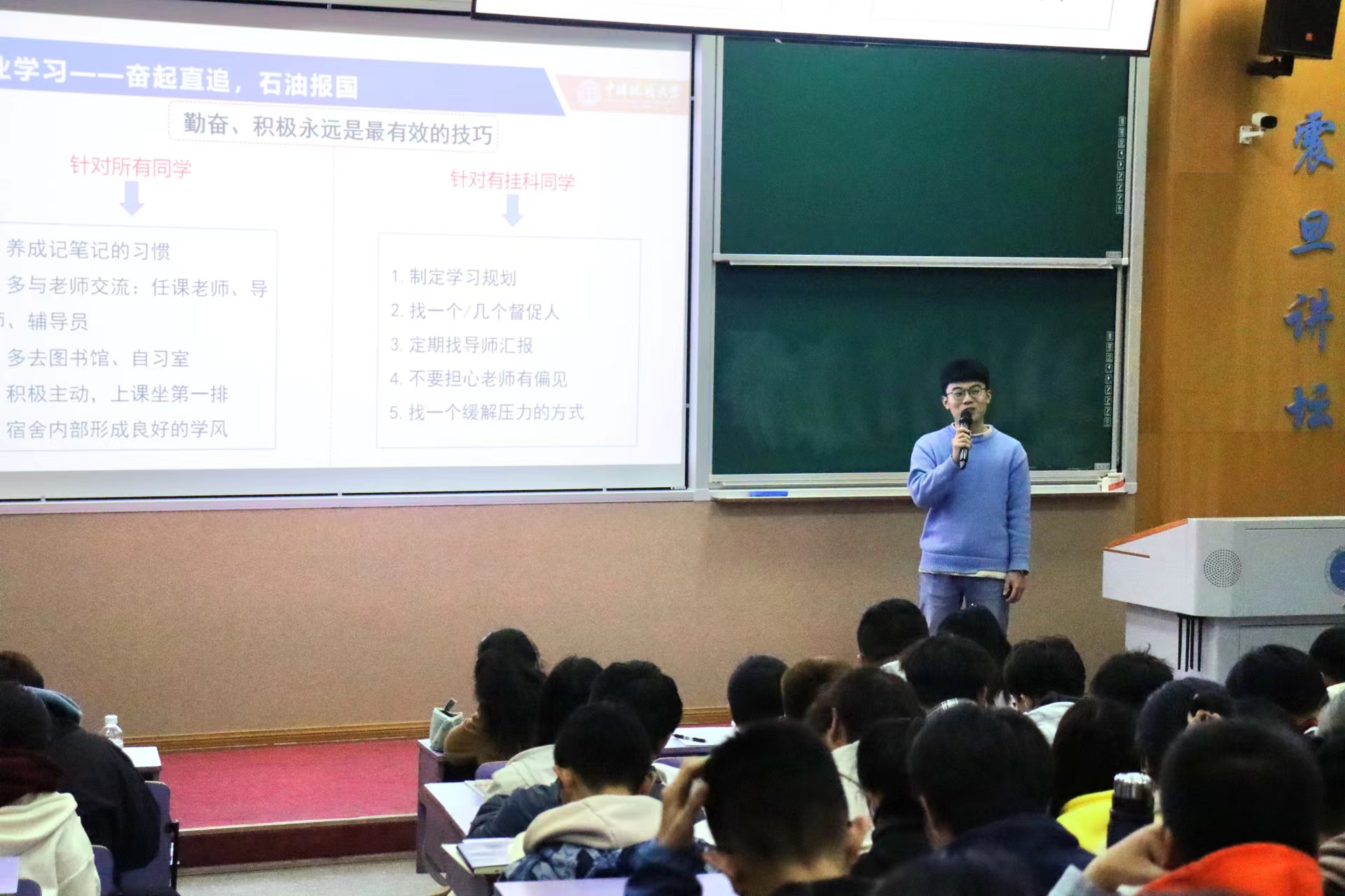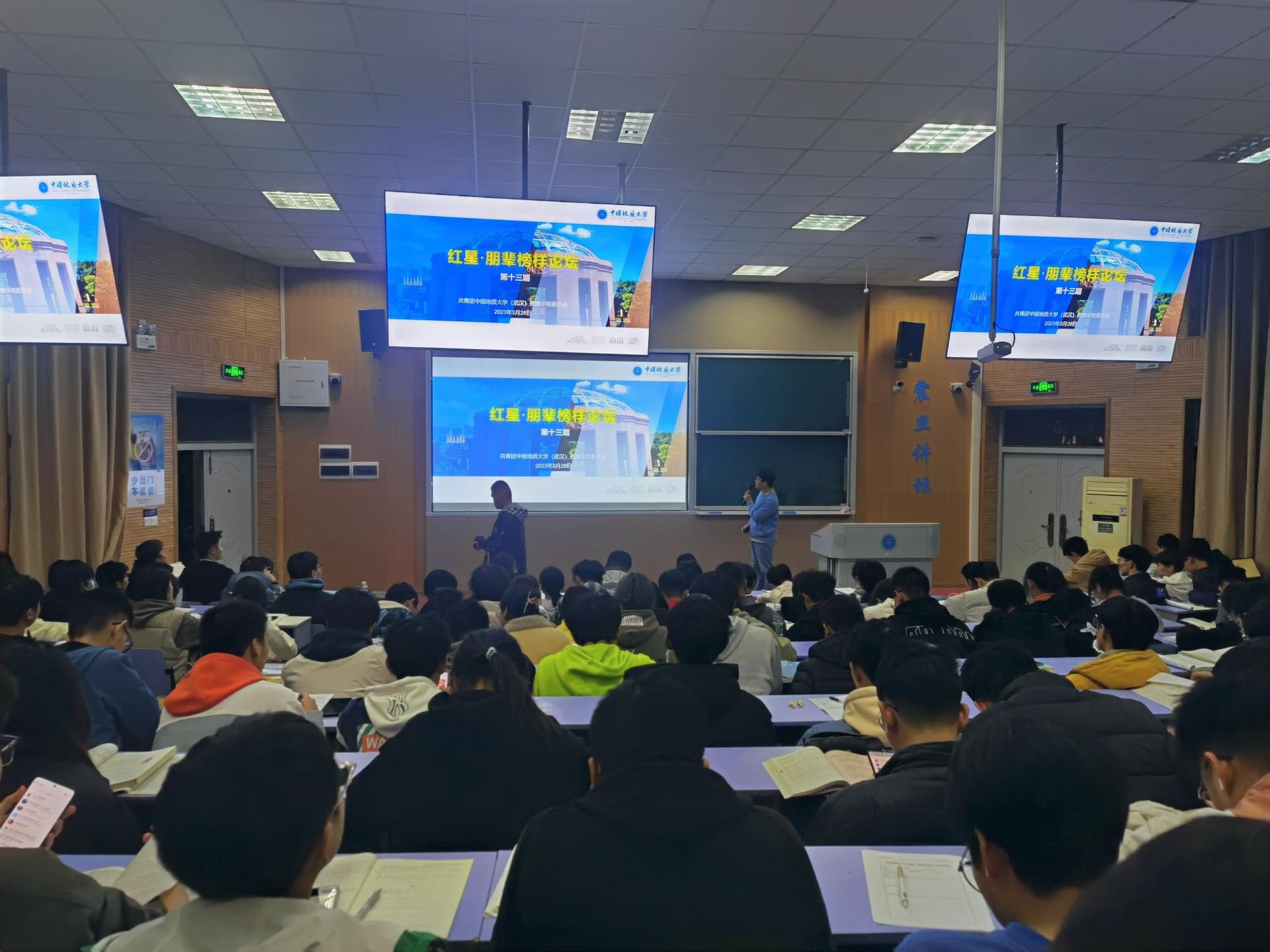 03月26日下午,beat365中文官方网站第十三期红星·朋辈榜样论坛在教三楼110举行。辅导员刘明辉,石油工程系2022级研究生聂思嘉,2022级全体本科生参加。刘明辉主持。
