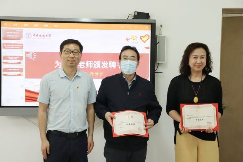 齐世学、谭文伦为志愿服务队队长、副队长、安全专员颁发聘书。