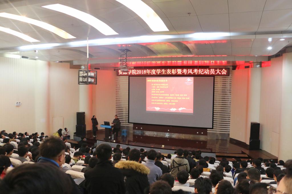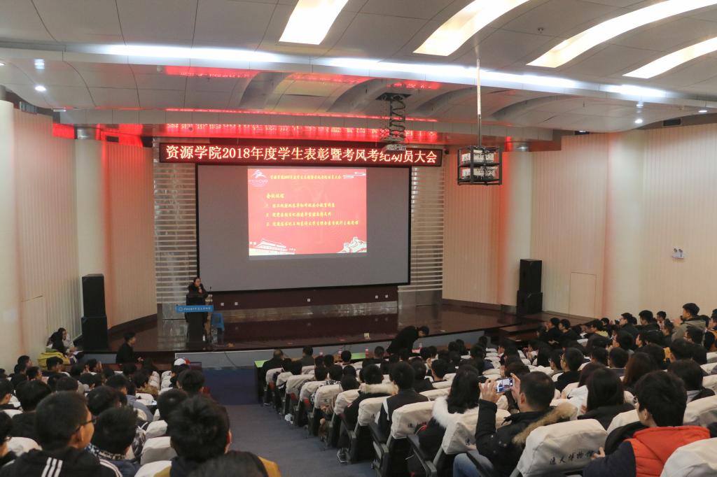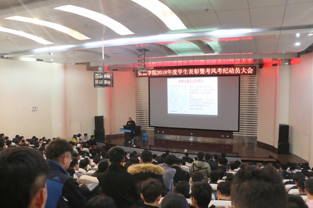 为进一步弘扬和践行“严在地大”的校风学风,扎实推进“双一流”建设,加强学风建设,严肃考风考纪,beat365中文官方网站2018年学生表彰暨考风考纪动员大会于12月20日下午在博物馆报告厅召开。保卫处副处长单红峰、院党委副书记张建华、院团委书记王向东、学工辅导员刘明辉、史邵贤和蒋钰鑫以及300余名本科生参加此次会议。刘明辉主持会议。