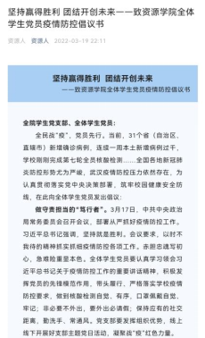 激发网络正能量,舒缓学生情绪,增强学生信心。学生党建工作办公室致全体党员《坚持赢得胜利 团结开创未来》,倡议全体学生党员在思想认识、遵规守纪、发挥作用上走在前列,做守责担当的“笃行者”,做冲锋在前的“实干家”,做苦练本领的“追梦人”。学生会、研究生会致全体学生《乘风破浪,不负春光》,倡议同学牢记使命担当、严守防疫政策,聚焦主责主业、不负美好春光,努力提升自己的专业知识和科研本领,参与体育运动,释放青春激情。