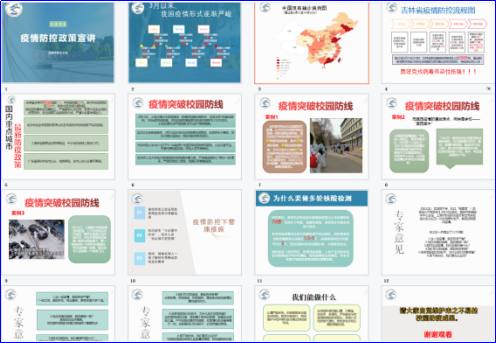制作疫情防控政策宣讲课件,各年级线上线下召开疫情防控政策宣讲会,辅导员集中讲述当前国内疫情形势,通过疫情突破校园防线的案例,引导同学加强自我管理,不断增强纪律意识、集体意识、责任意识、公共意识。