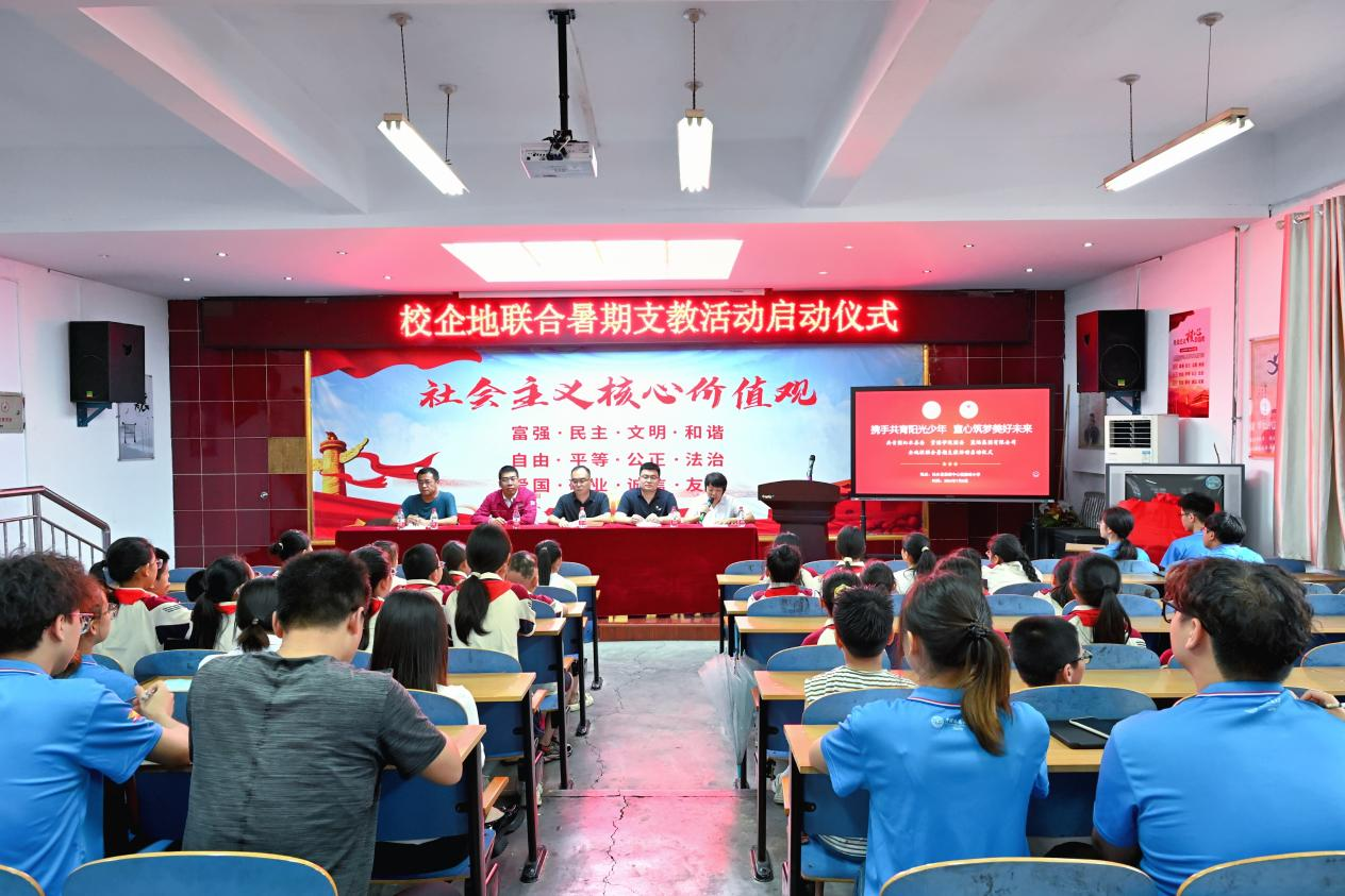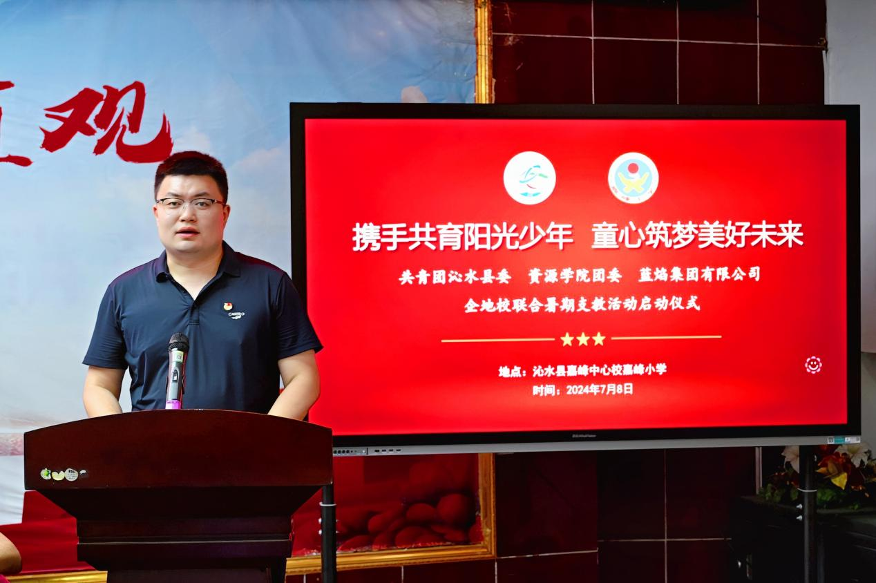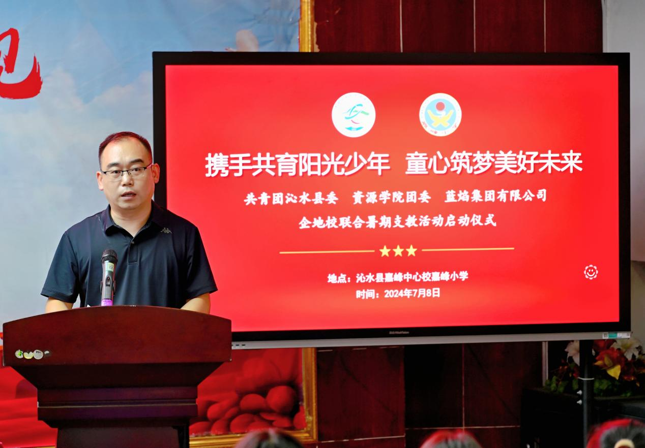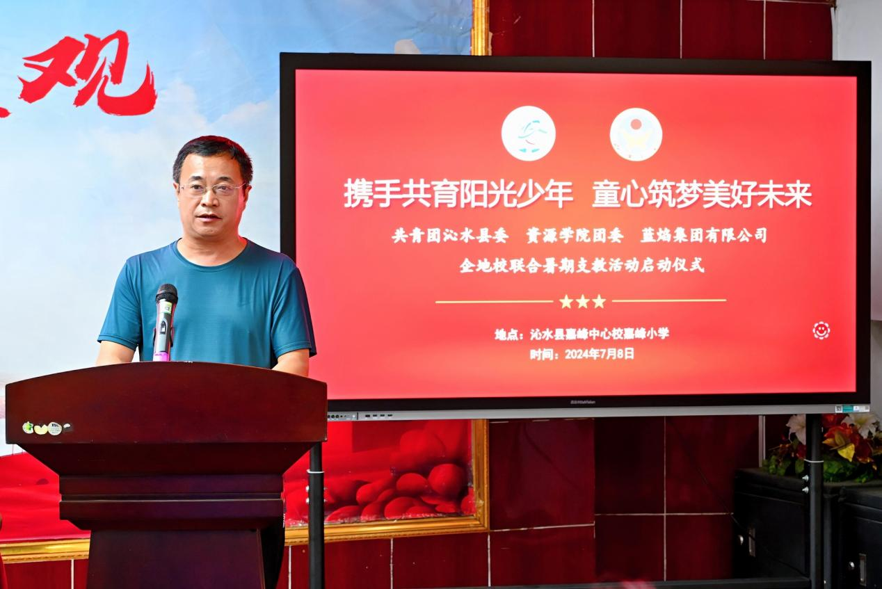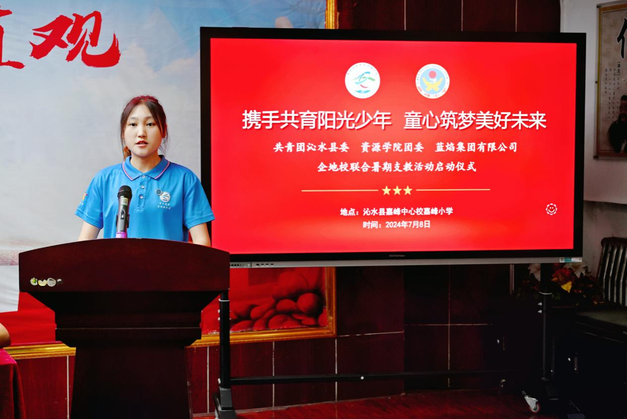 7月8日下午,beat365中文官方网站团委和蓝焰集团有限公司、共青团沁水县委联合举办的“携手共育阳光少年 童心筑梦美好未来”暑期支教活动在沁水县嘉峰小学启动。共青团沁水县委书记王雄,学院团委副书记彭鑫,嘉峰镇嘉峰中心校校长杨震宏,蓝焰公司党群工作部团委主办李昭出席活动,嘉峰小学教职工代表,“牵手筑梦”实践服务团成员,参与暑期支教的嘉峰小学学生参加活动。