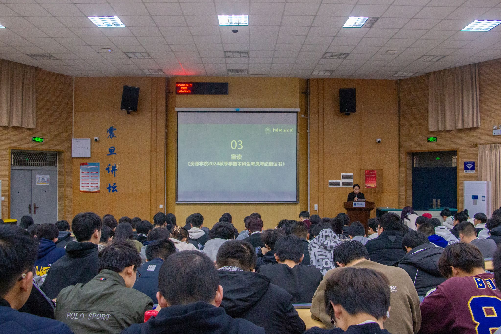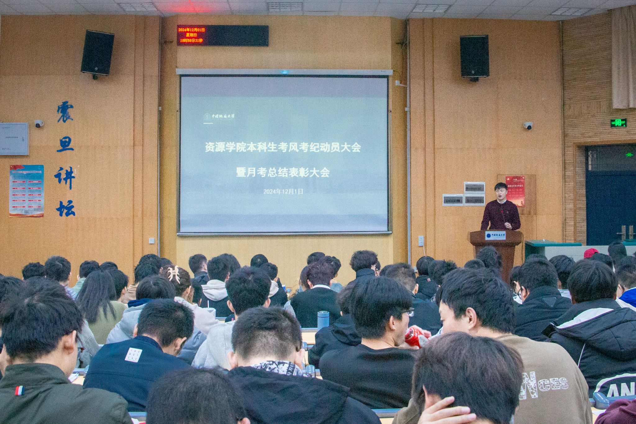 谭文伦总结讲话。他谈到,学院高度重视基础学风建设工作,自全面、系统强化学风建设以来,学院学风逐渐向好、学生学业基础不断厚实,资源学子在学生科研立项、学生科创赛事等方面都取得了良好的进展。他强调,全体同学要遵守《学生手册》的规定,严肃考风考纪,严格杜绝考试作弊等行为。他希望,全体同学扎实开展期末复习备考,在考试中取得优异成绩。