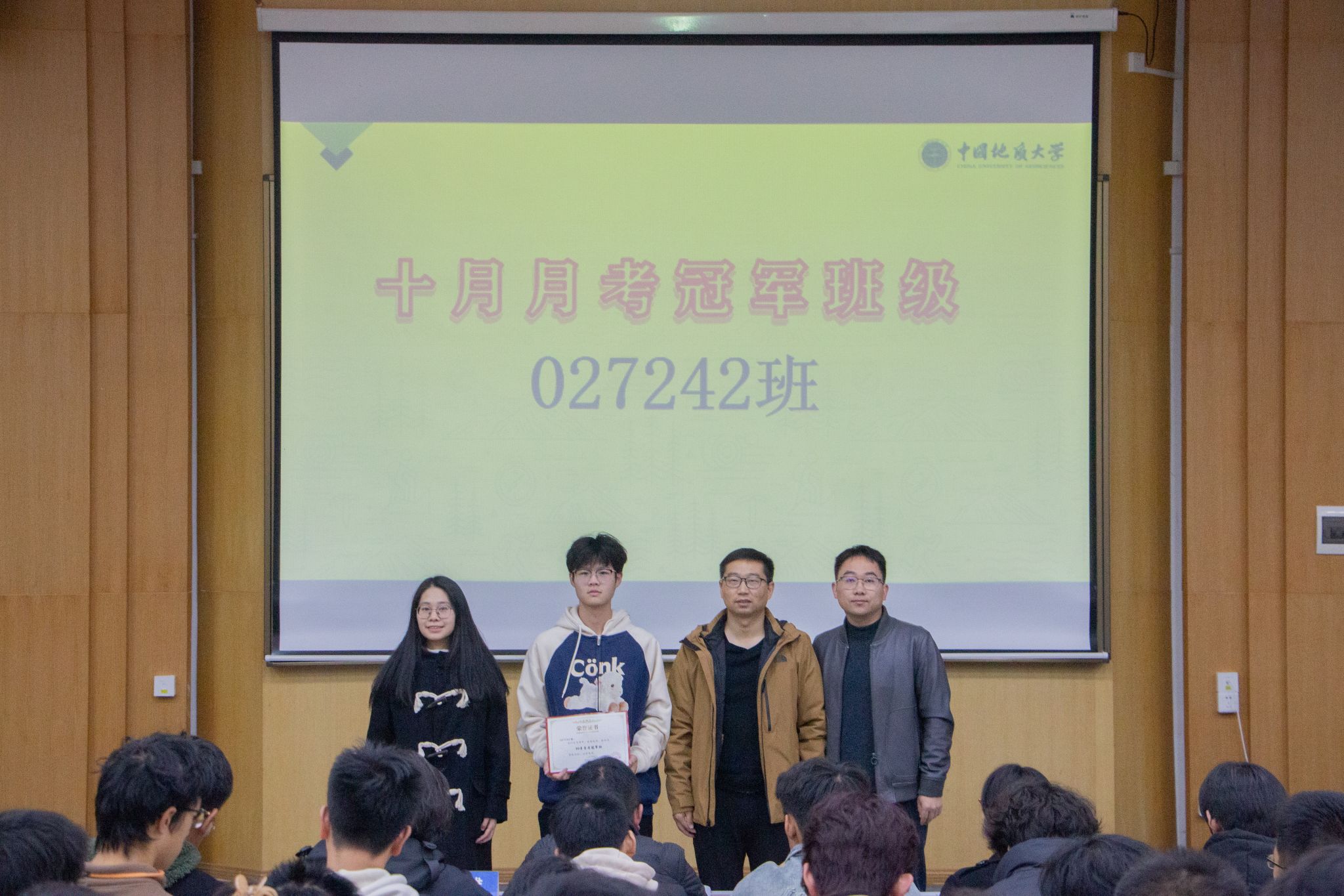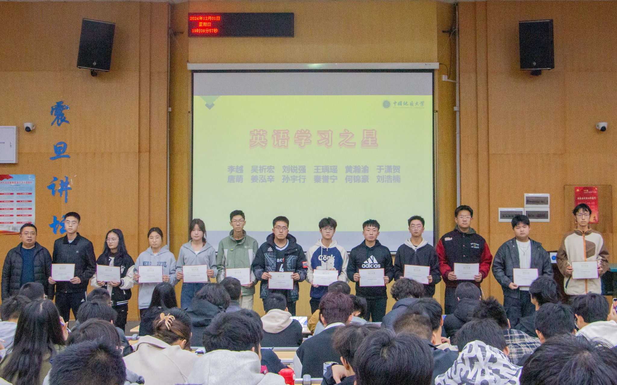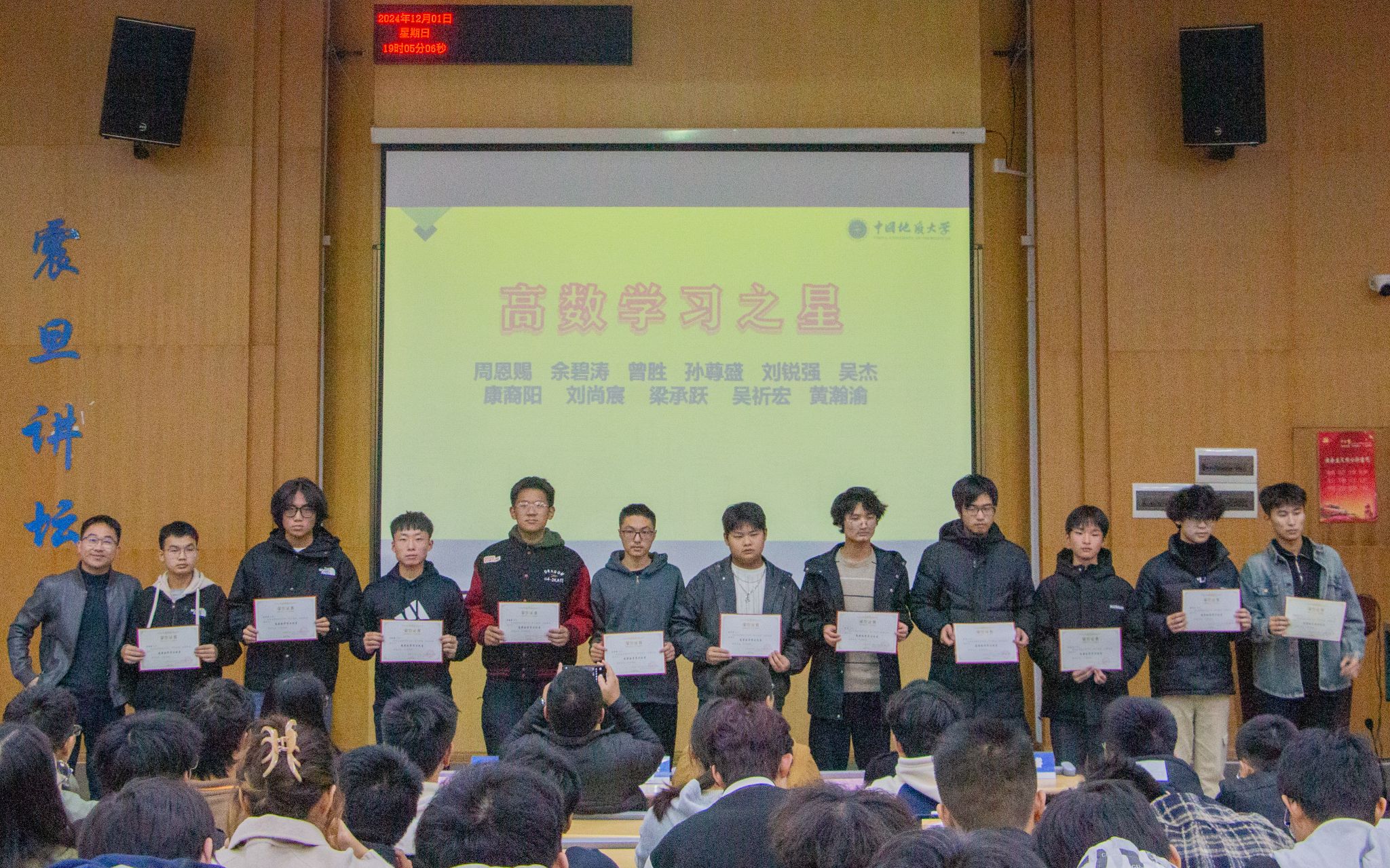 在月考表彰环节,王维、付乐兵分别为“高等数学学习之星”“英语学习之星”颁发奖状;谭文伦为“十月月考冠军班级”颁发奖状,班主任、班长、助理班主任共同上台领奖。