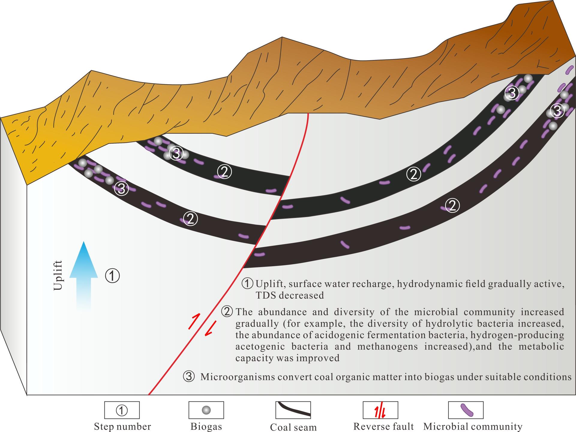 最后,论文基于微生物群落结构演替规律、基因功能变化以及产气模拟实验结果,结合地质演化过程,还原了构造抬升背景下深部煤层中本源菌群受到激活,逐渐大量形成次生生物气的地质过程,可进一步划分为3个阶段:1)煤层抬升,地表水补给,水动力场逐渐活跃,矿化度降低,营养物质得到补充;2)微生物群落的丰度和多样性逐渐增加,物质代谢能力得到了提高;3)微生物将煤岩有机物转化为次生生物气(图4)。