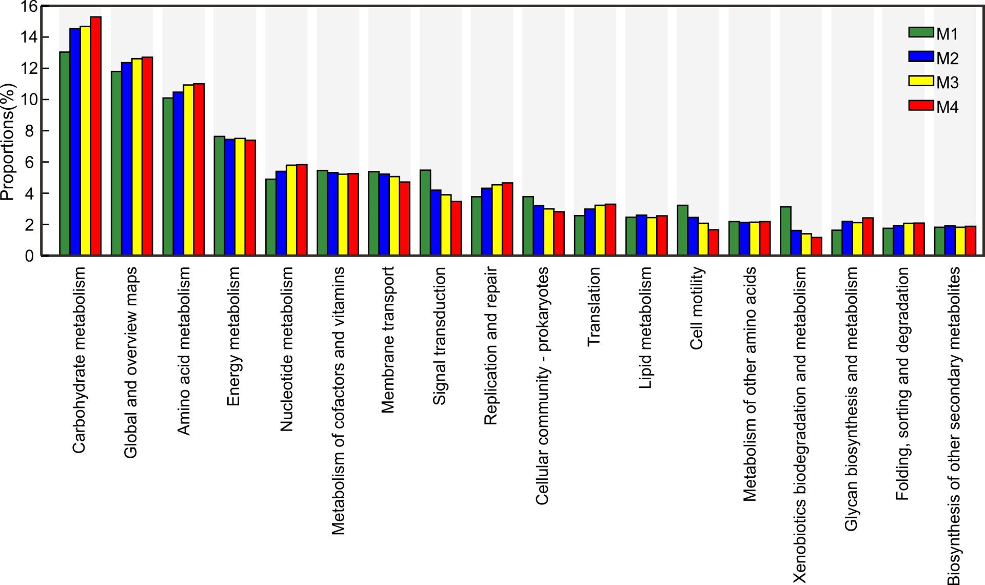低矿化度的环境条件促进煤厌氧发酵产气的原因在于微生物群落结构得到了优化,即,使得水解菌群、产酸菌群、产氢产乙酸菌群与产甲烷菌群形成有效耦合的配置关系。从更深层次的基因功能层面来看,低矿化度的环境条件提高了微生物中与代谢相关基因功能的丰度,增强了微生物的物质代谢能力(图3)。