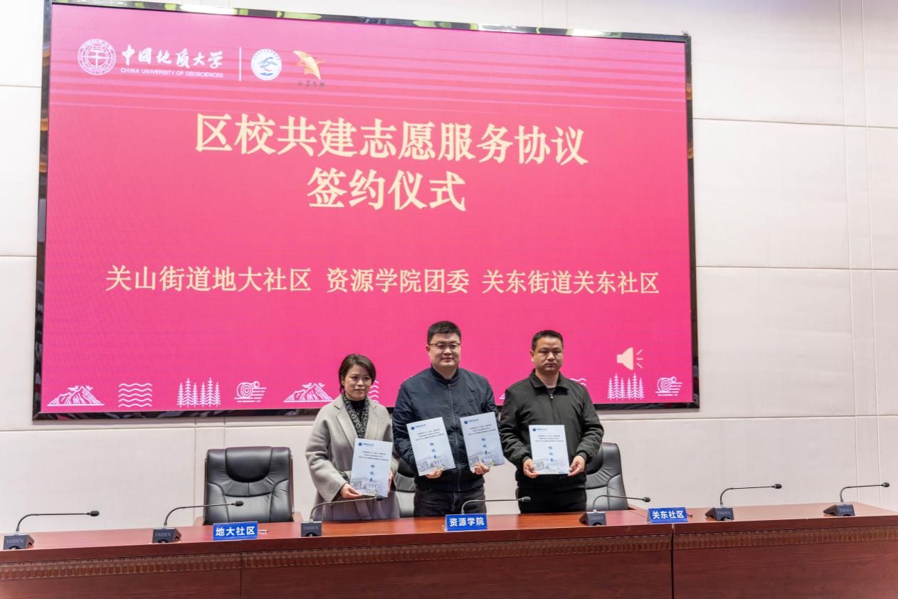 签约环节,关山街道地大社区、关东街道关东社区与beat365中文官方网站团委共同签署区校共建志愿服务协议,区校双方将以共建为契机,强化务实合作,共同推动青年志愿服务工作水平全面高质量发展。