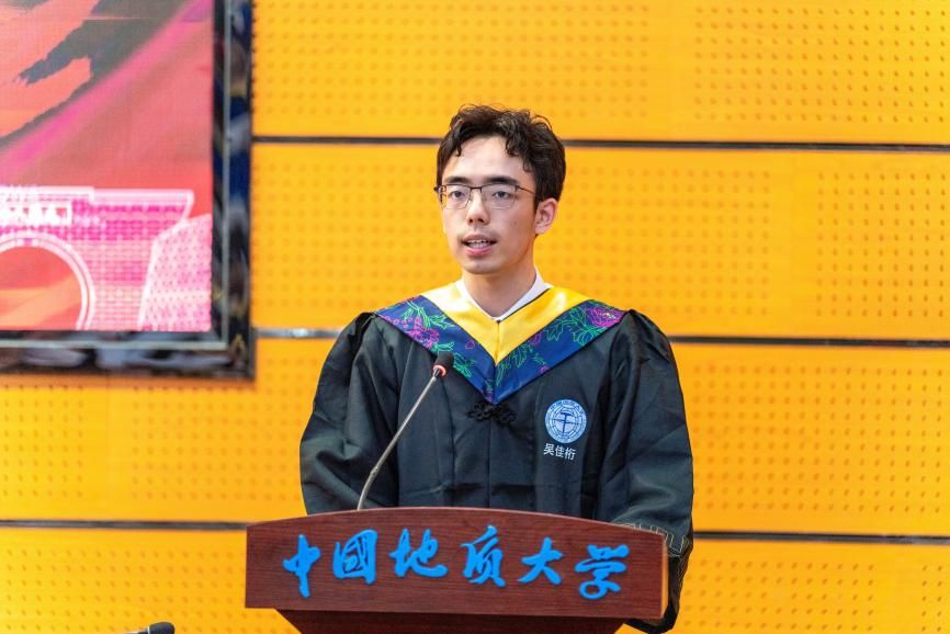 本科毕业生代表吴佳桁发言。他带着对师长、亲友的深深感恩,回顾了四年大学时光的丰富经历与显著成长。他感慨,大学中的所见所闻、所学所得、所思所感,不仅让他收获了知识,更赋予了他面对挑战的底气与砥砺前行的动力。吴佳桁表示:面对未来,他会立志投身地质行业,为保障国家能源资源安全贡献力量。同时,他勉励同学们秉持初心、心怀家国,在新时代的征程中继续奋斗,永远做有梦少年,共同书写无愧于时代的壮丽篇章。