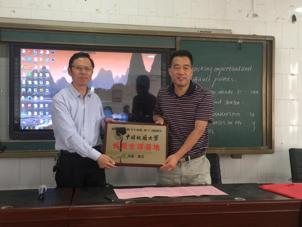 5月24日上午10时许,朱红涛教授一行走进河南省尉氏三中(南校区),受到了焦凤民校长等学校领导的热情接待。在座谈会上,通过播放《与地大·共芳华》的beat365宣传视频,让尉氏三中(南校区)与会人员直观的了解到beat365基本情况。然后朱红涛详细介绍了beat365教育教学、学科建设、产学研平台、人才培养等方面的优势,并与尉氏三中(南校区)学校领导及年级主任就学生关切的问题进行了详细的交流。随后,双方签署了《联合共建优质生源基地协议书》,朱红涛代表学校向该授予优质生源基地铜牌。