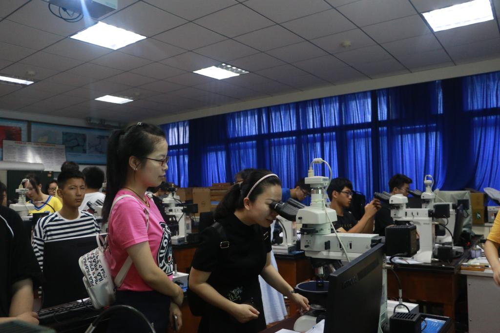 7月11日上午8:30,“体验地球科学之石头会说话”在主楼330、332实验室开展。江满容老师和刘安璐老师指导学生进行镜下光片鉴定和矿石标本观察。通过观察和实践,营员们了解了基本的矿石类型及矿产资源在国民经济发展中的重要作用。