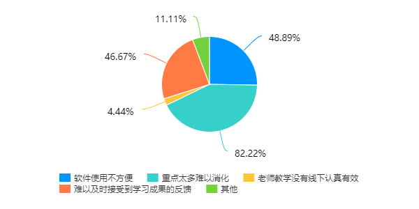 从与线下课程的比较来看,88.89%的同学认可线上课程在“可重复观看,时间自由”比线下课程更具有优势,而超过半数的同学认为线上课程签到打卡方便,还有少部分同学认为师生交流便利、课程信息量大以及教学方式新颖也是本门网课的优点所在。不过,也正是因为课程信量大,有82.22%的同学同时认为该网课重点太多难以消化,同时有近一半的同学认为软件使用不太方便,而且由于内容太多很难及时收到学习成果的反馈。此外,还有同学写道,电子版的教材使用依旧逊色于实体教材,而自己有什么问题也无法和老师及时沟通,若是在学校可以当面问老师。也有极个别同学反映自己的网络状态不稳定,如果卡顿了一会之后很难再接续上思路,只能靠自己摸索,同时签到系统偶尔也会出bug,明明签到了却显示没有签到。