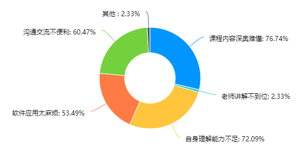 问卷显示,77.78%的人群通过PC端来进行本课程的学习,这主要是因为本课程的理论应用与实习作业多通过VFP数据分析软件实现,而剩余的22.22%的人群则称手机、平板等也是观看网课的必要移动设备。在网络状况方面,有33人认为网络“基本流畅,偶尔有卡顿”, 8人认为“非常流畅,没有问题”,剩余4人则坦言“比较糟糕,时常掉线”,总体来看,能满足大多数同学上网课的基本要求。对于本门课程的难易程度,超过95%的同学认为很难或较难,究其根本,除了课程内容较为深奥外,自身理解能力不足、软件应用麻烦、沟通交流不便也是同学们普遍认同的原因。