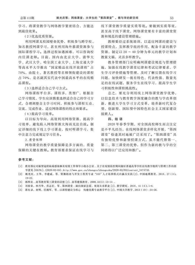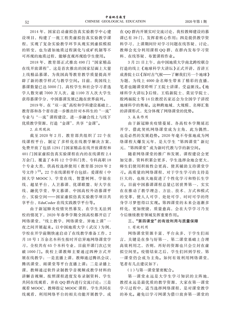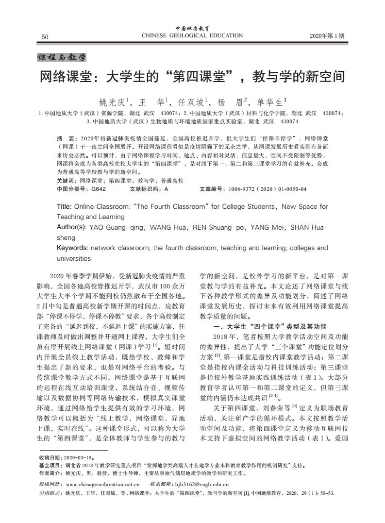 编者按:当前,新冠肺炎疫情蔓延势头得到有效遏制,防控工作取得阶段性成效,为深入贯彻落实习近平总书记关于统筹推进疫情防控和经济社会发展的系列重要讲话精神,在学校统一部署下,beat365中文官方网站全体教师克服重重困难,创新运用线上教学新形式,积极总结教学经验与成果。《线上教学进行时》第十期,让我们一同了解姚光庆,王华,任双坡等五位教师发表在《中国地质教育》期刊上的文章《网络课堂:大学生的“第四课堂”,教与学的新空间》。