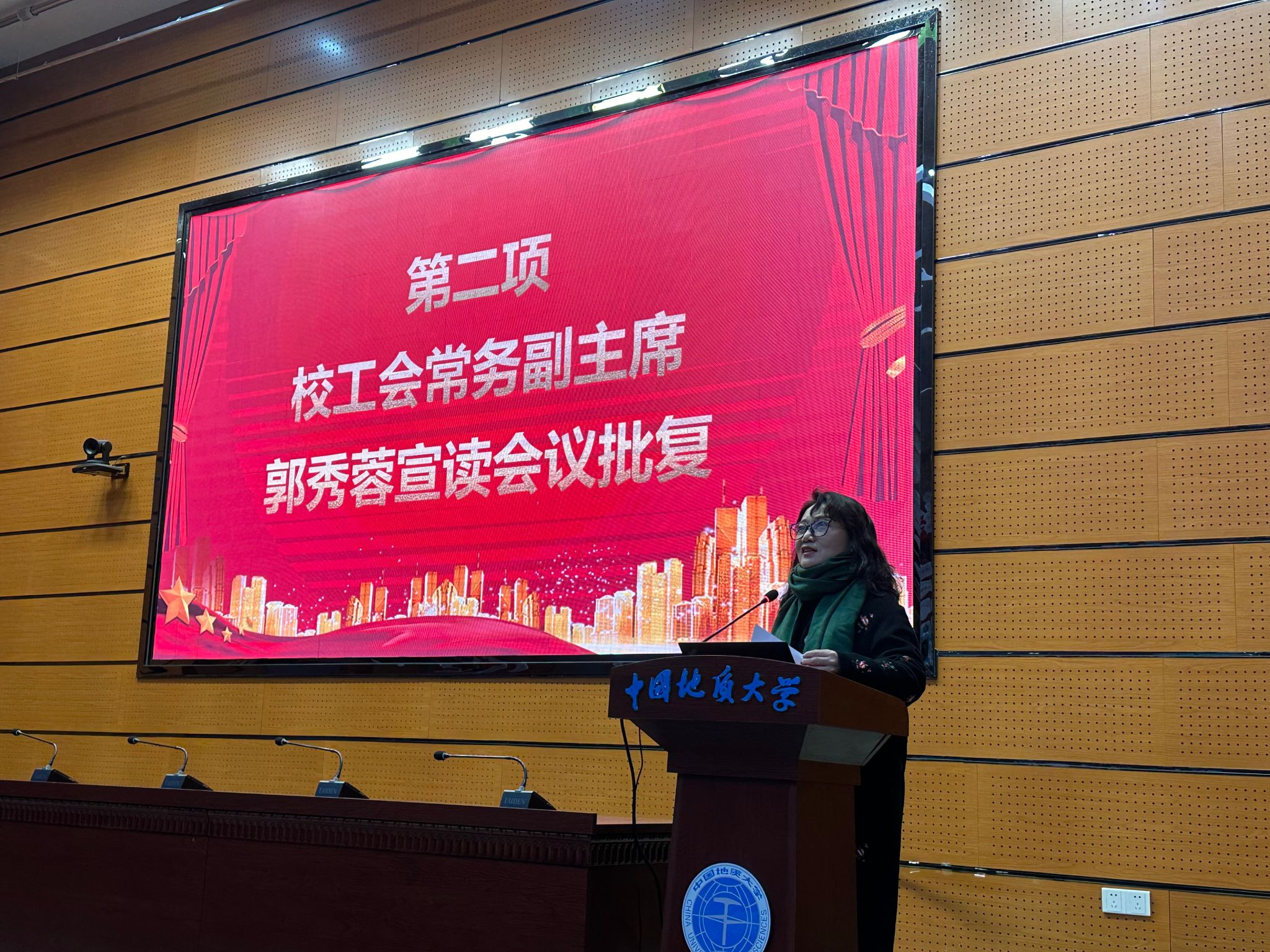 郭秀蓉宣读《beat365中文官方网站第四届教职工代表大会第三次会议暨第四届工会会员代表大会第三次会议的批复》。