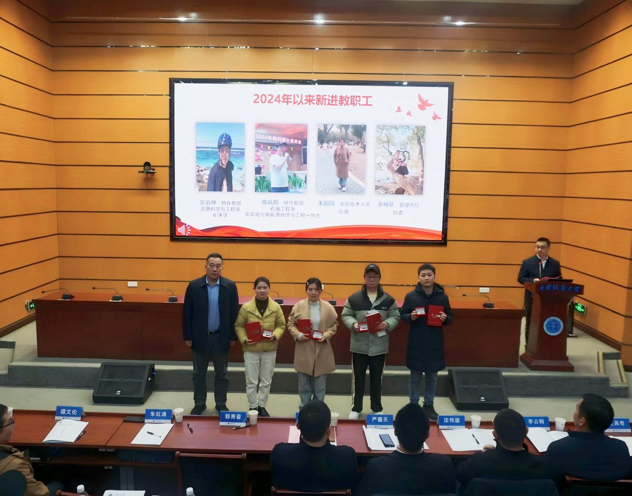学院副院长朱红涛为新入职教工苏治坤、熊凤阳、朱园园、黄梅娇颁发院徽及初心记录本。