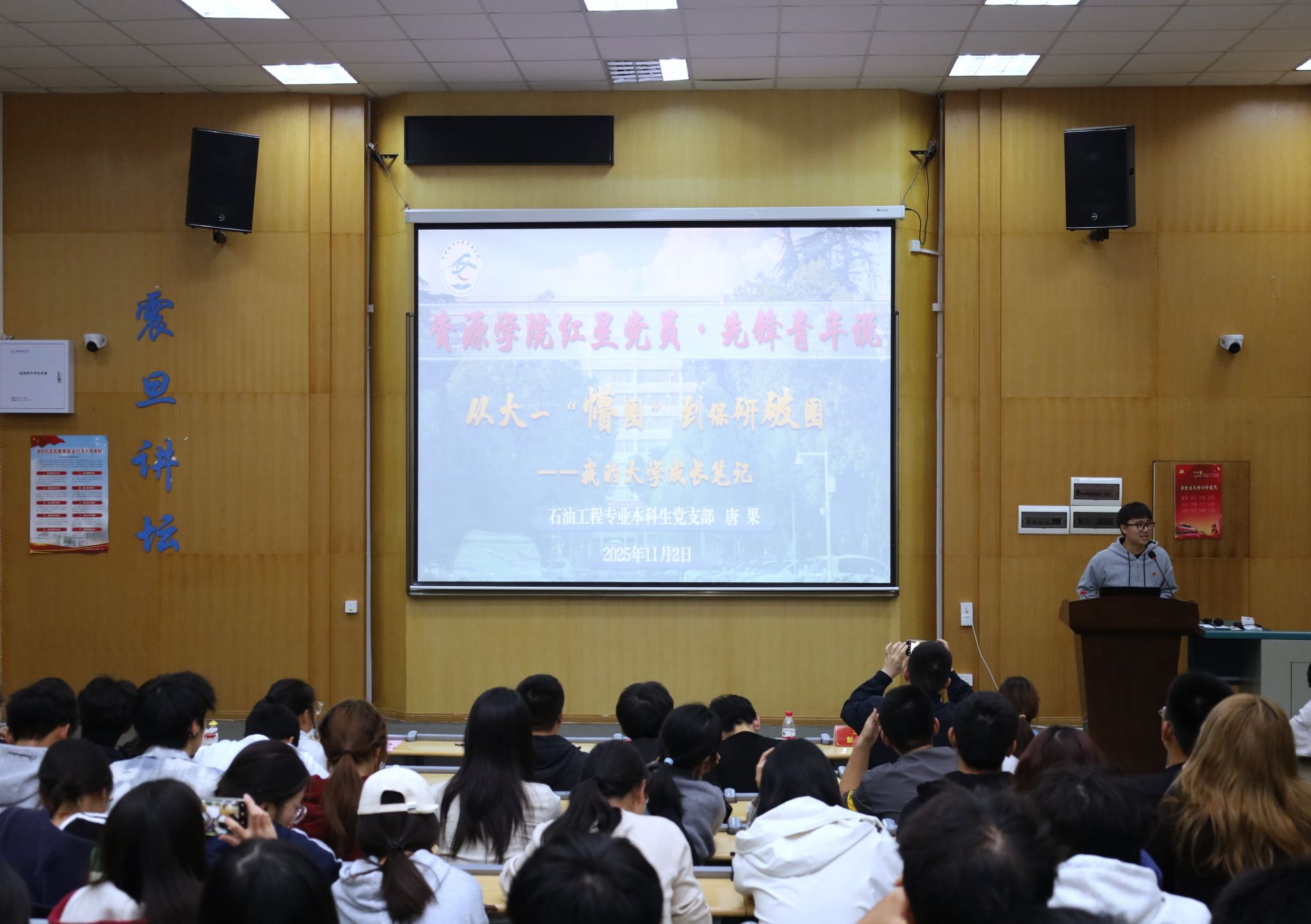 第十四届“挑战杯”全国银奖、2025年国家奖学金获得者、油气开发地质研究生党支部高旭东,以“怀能源报国之心,做勇攀高峰之人”为题,从先锋示范、志愿服务、社会实践、科研攻关等四个方面分享了自己科创成长故事,鼓励不必畏惧探索荆棘,唯有扎根专业、勇于实践、敢于创新,方能为国家能源安全筑牢屏障,让青春在报国奉献中熠熠生辉!