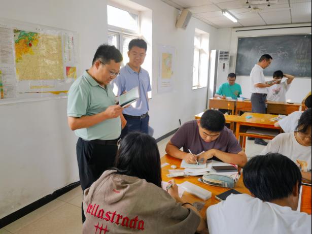 随后,高复阳、严德天来到教室,与正在完善野簿、绘制图件的学生交流。他们查阅学生野簿,询问学生在基地学习、生活情况,勉励同学们要保持刻苦求索的状态和一丝不苟的精神,扎扎实实完成野外教学各项任务,在全身心投入中练就过硬本领,磨砺个人意志,为未来事业发展打好基础。