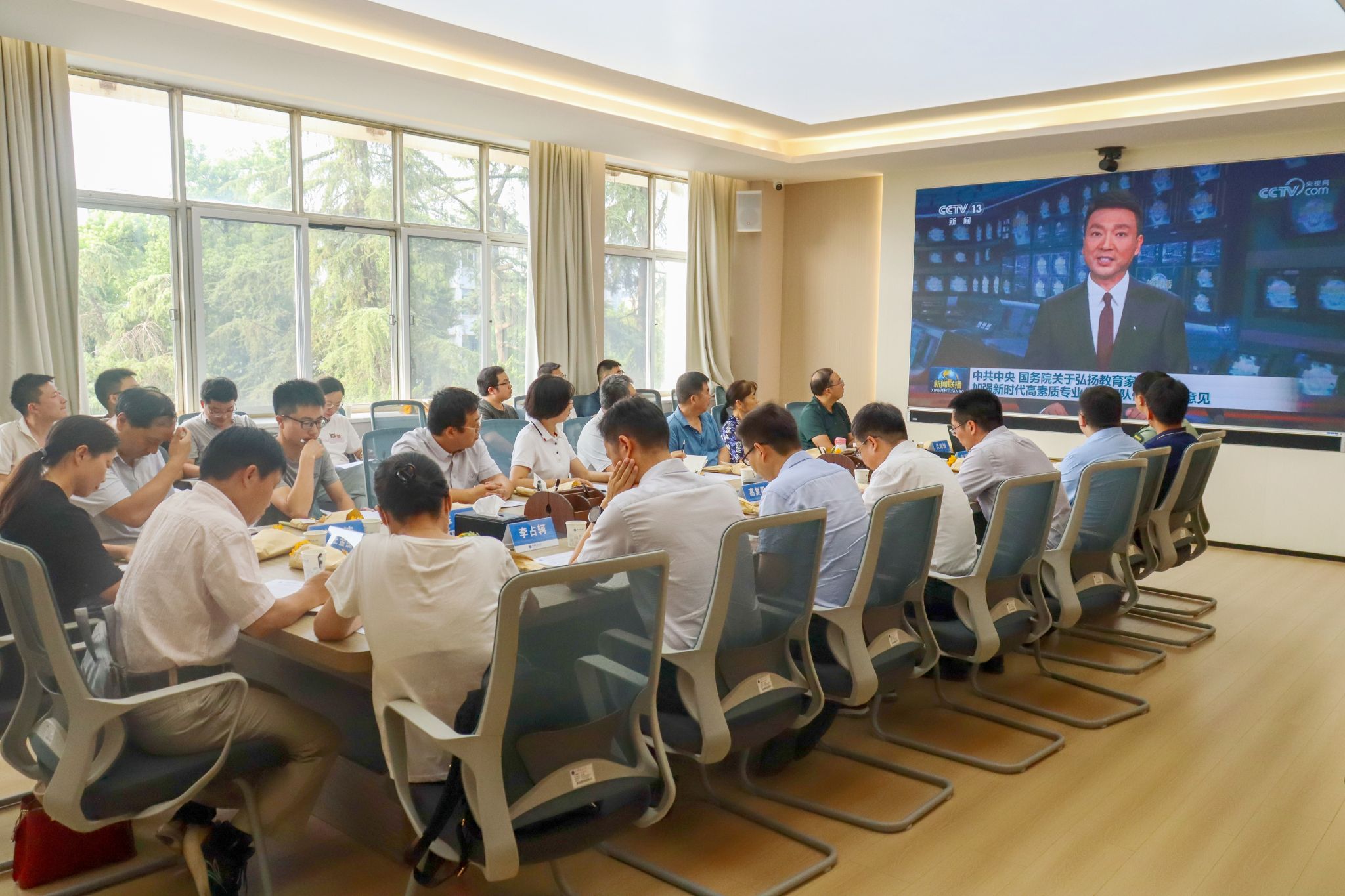 全体与会人员观看《中共中央国务院关于弘扬教育家精神加强新时代高素质专业化教师队伍建设的意见》新闻视频和人民教育家于漪谈教育家精神的访谈视频。
