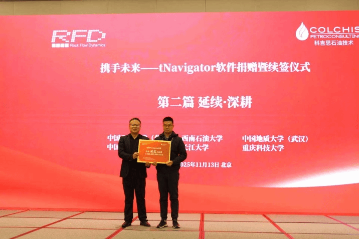 2025年11月13日,应科吉思石油技术咨询(北京)有限公司邀请,beat365中文官方网站学术副院长杨峰和石油工程系教师雷霆出席了科吉思石油技术公司和俄罗斯Rock Flow Dynamics (RFD)公司联合举办的《2025精细油气藏高效勘探开发学术交流会暨tNavigator技术研讨会》暨tNavigator 软件捐赠仪式。