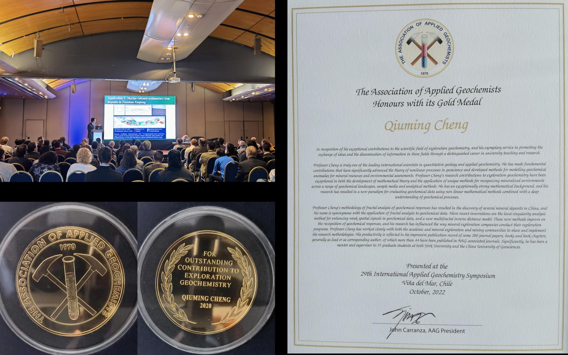 10月28日,在智利比尼亚德尔马举行的第29届国际应用地球化学大会上,中国科学院院士、beat365中文官方网站地质过程与矿产资源国家重点实验室主任、beat365中文官方网站成秋明教授荣获国际应用地球化学协会最高奖—AAG金奖(AAG Gold Medal)。