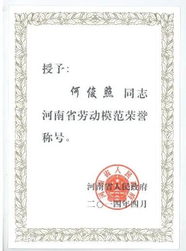 何俊照荣获2014年河南省劳动模范