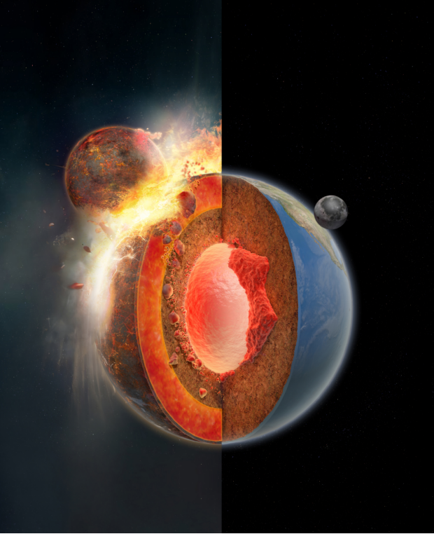 目前广为接受的月球起源理论为48多年前提出的“大碰撞”假说。该理论认为在太阳系形成早期,曾有一颗火星大小的行星胚胎(被称为“忒伊亚”)高速(约10 km/s)撞击了原始地球,溅射出了大量碎片,而月球便从碎片盘中聚合生长而成。然而高精度的同位素测量显示地球和月球的成分极其相似,极大地挑战了这一月球形成的标准理论;而新的高能/高角动量碰撞模型虽然可以解释地月同位素的相似性,却将不可避免地导致地球地幔完全熔融并混合均匀。然而,这种均一地幔的推论与众多地幔地球化学以及地球物理观测证据直接矛盾。所以,如何调和大碰撞理论、地月同位素一致性, 以及地球地幔不均一性问题是一个跨学科、跨领域、跨时空的重大科学问题。