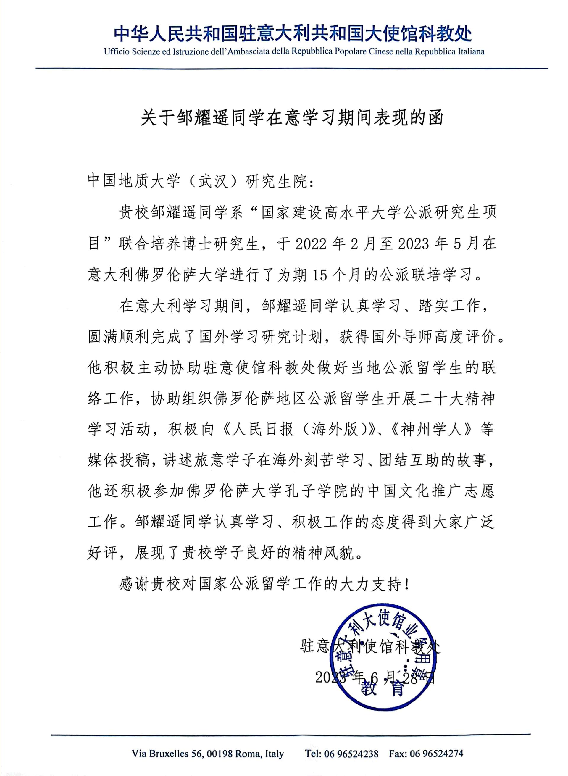 邹耀遥,我院矿产普查与勘探专业2019级博士研究生,beat365第十三次党代会代表、校博士生讲师团成员。在沈传波教授的指导下,他主要开展含油气裂谷盆地的三维构造分析、构造热年代学及构造物理模拟实验研究,曾获研究生国家奖学金、校级优秀研究生标兵、校优秀学生党员等荣誉称号。2022年2月,获国家留学基金资助前往意大利佛罗伦萨大学进行博士联合培养,期间积极向《人民日报(海外版)》《神州学人》投稿,讲述旅意学子在科技合作与文化交流中的奋斗故事,获评全意学联“旅意学子优秀志愿者”,获我国驻意大利大使馆科教处致函表扬。